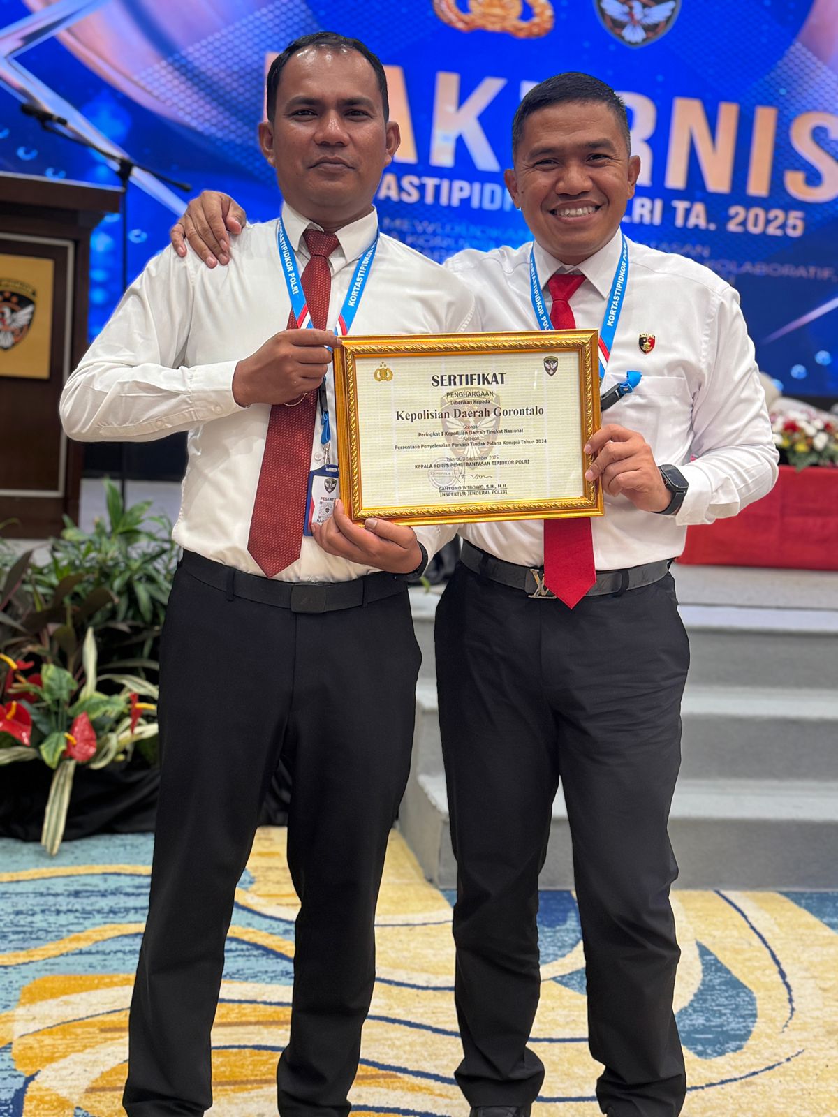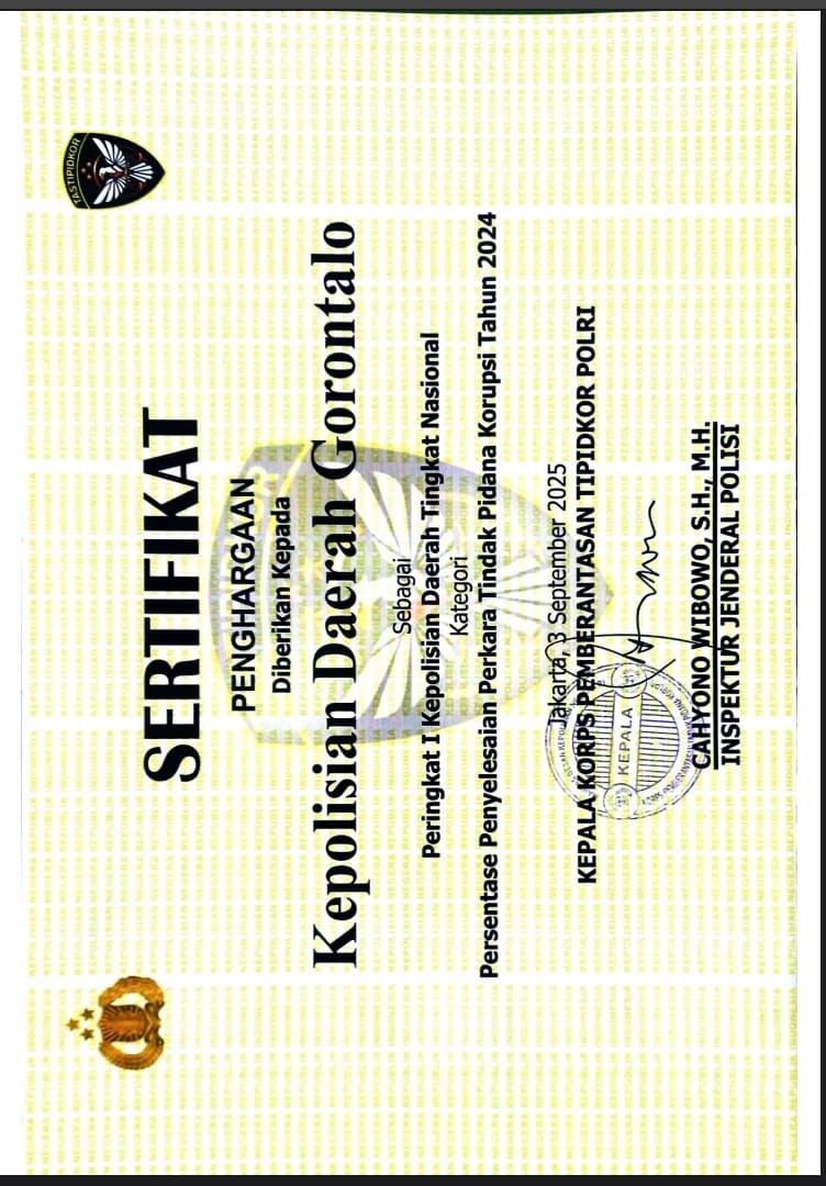 Dalam sertifikat penghargaan yang diterima, Polda Gorontalo dinilai menunjukkan komitmen kuat, konsistensi, serta kinerja optimal dalam menuntaskan berbagai kasus korupsi sepanjang tahun 2024- 2025. Capaian ini menjadi bukti nyata kesungguhan jajaran kepolisian Gorontalo dalam menghadirkan penegakan hukum yang transparan, profesional, dan berintegritas tinggi. Direktur Reserse Kriminal Khusus Kombes Pol. Dr. Maruly Pardede, S.H., S.I.K., M.H., mengungkapkan rasa syukurnya atas apresiasi nasional tersebut. Menurutnya, keberhasilan ini adalah buah kerja keras seluruh personel yang tak kenal lelah dalam mengawal penegakan hukum di daerah.